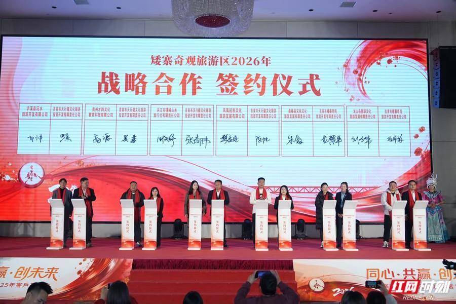 矮寨奇观旅游区。红网时刻新闻1月25日讯(记者 何超 通讯员 彭丽)1月25日,在湘西吉首举办的矮寨奇观旅游区客户答谢会上透露,2025年矮寨奇观旅游区全年接待游客达120.67万人次,实现旅游收入1.22亿元,收入同比增长21.83%,品牌总曝光量超6000万次。活动上,主办方吉首市天行健文化旅游投资开发有限责任公司与吉首市矮寨奇观旅游开发有限责任公司对过去一年的合作成果进行了盘点。现场回顾了矮寨奇观旅游区四十年发展历程,宣读了表彰通报,向合作单位颁发了“文旅传播先锋奖”“最佳战略合作伙伴奖”“业绩贡献奖”等九大奖项。会议现场举行了年度合作签约仪式,矮寨奇观旅游区与多家旅行社、研学机构签订年度合作协议,内容涵盖客源输送与产品开发,为2026年市场开拓筑牢基础。在产品与政策推介环节,景区负责人介绍了文旅融合与业态升级的新规划,湘西州文化旅游服务中心负责人现场解读了“引客入湘”相关扶持政策。吉首市委副书记、市长张俊表示,“十四五”期间吉首已连续五年入选全国县域旅游百强,未来将锚定“湖南生态文化旅游新高地”目标,强化以矮寨大桥与乾州古城为核心的双极驱动,并以最优政策深化政企合作,共促吉首文旅发展。举报/反馈