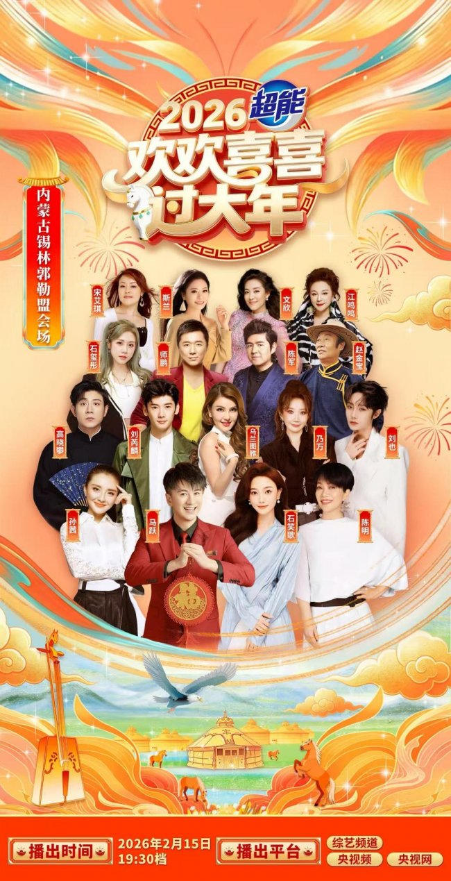 2月15日(大年二十八)19:30档,相约总台《欢欢喜喜过大年》, 此外,节目还将在CCTV-1综合频道安排重播,让更多人领略内蒙古锡林郭勒的草原风采。